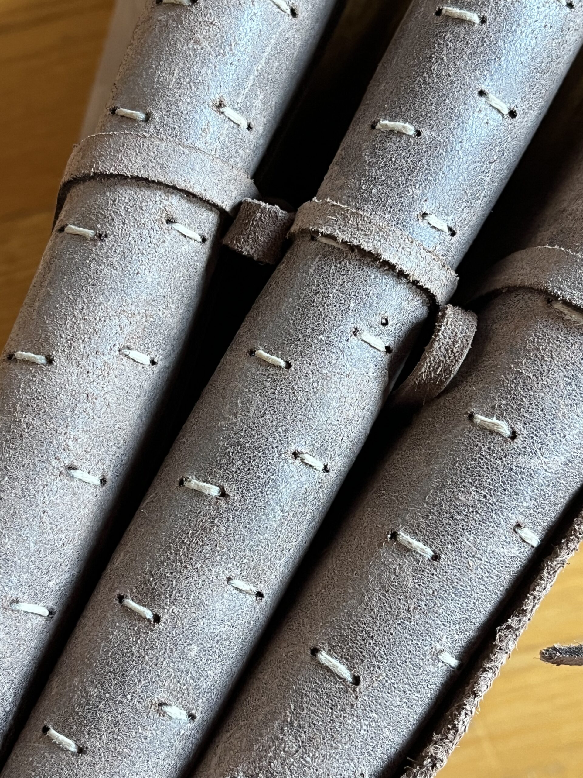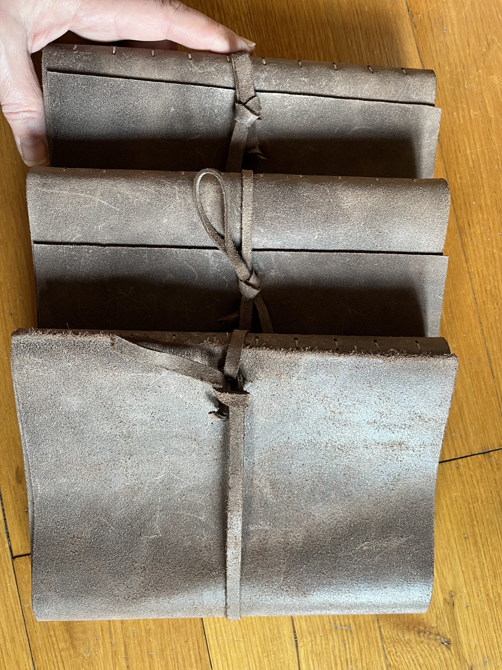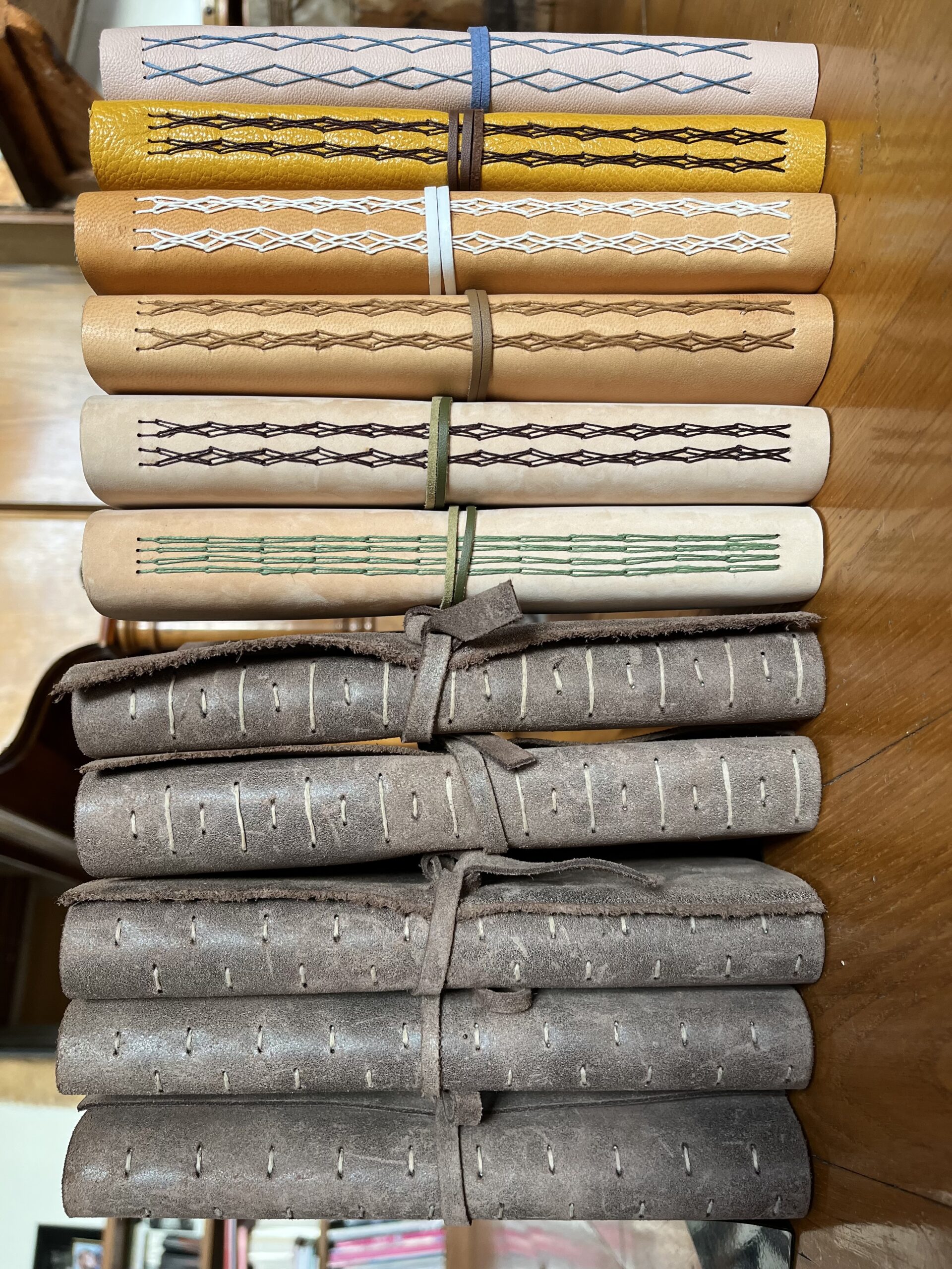 Le terme anglais « longstitch » peut être traduit par « point long ». Cela signifie que les pages du carnet sont cousues à travers et tout le long de la couverture, en créant un motif qui sera visible sur l’extérieur de la couverture. Le motif utilisé est appelé « woven chain » dans le livre de Keith A. Smith Non-adhesive binding, volume II.